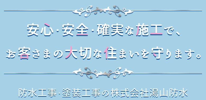 株式会社湯山防水のホームページをご覧いただき、ありがとうございます。弊社は東京都東村山市を拠点に、東京都・千葉県・埼玉県・神奈川県など関東近郊で防水工事や塗装工事を行なっております。『親切な対応と確かな施工』をモットーに、幅広い工事に対応しています。経験豊富なスタッフが屋上防水や雨漏り修理、住宅塗り替えなど、さまざまなニーズに柔軟に対応します。